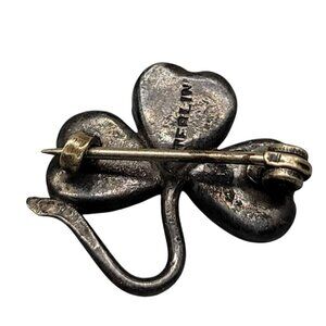 This antique sterling silver pin features a beautiful abalone inlay in a 3-leaf clover design. With a classic C clasp, it's perfect for adding a touch of vintage charm to any outfit. Ideal for collectors or as a unique gift.