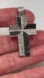 Gorgeous sterling cross pendant with pave set black spinel and clear CZ's, each hand pave' set. The arms are angled toward the center with alternating sections of black and clear. The bale is set with two rows of clear stones. The pendant is marked 925 on the inside of the bale and measures 1 3/4 by 1".