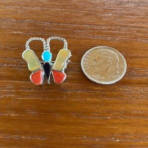 Petite butterfly in a sterling silver pendant and pin set with coral, turquoise, onyx and shell. 3/4” x 3/4”. New.
