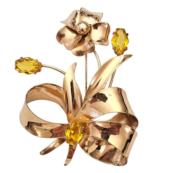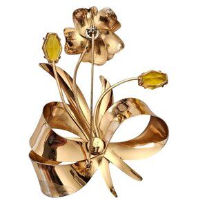This Serling By Jordan Flower Brooch is a gorgeous piece that will dress up any outfit. It features a stemmed flower figural in radiant gold tone, crafted from sterling gold vermeil, it is a high quality (pure or sterling) silver that is plated with a thin layer of gold. The fully bloomed flower is highlighted with three faceted hexagon-shaped yellow Uranium glass rhinestones individually and securely prong set that exquisitely glow in the dark. Two of these beauties are placed on the tip of thin stems and the other one is at the center of the chunky bow design. It measures approximately 2.8 inches in length, a substantial size to make a subdued statement pin for your lapel or outfit. The back has a round plaque marked STERLING BY JORDAN. It is secured with a locking pin mechanism which is sturdy and firm, allowing the piece to be easily attached to clothing or accessories.
