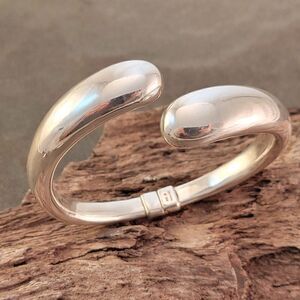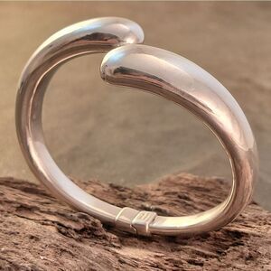 Easy to wear spring hinge bangle rounded tip bypass bracelet in sterling silver. The piece is hollow, not heavy to wear. This is a super easy to put on and off bracelet!
