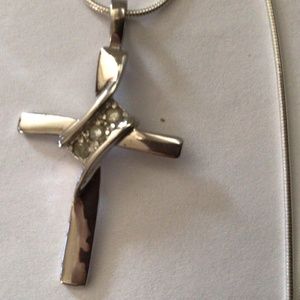 Highly polished beautiful sterling silver cross and chain. Three 5-point diamonds prong set diagonally “draped” across the cross. The bale is stationary as it is part of the cross.