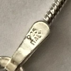 Chain: 16” snake marked 925 Italy. Pendant: 1-1/4” tall x 3/4” wide. 4.47 grams. Marked 925 and signed. Cannot discern designer.