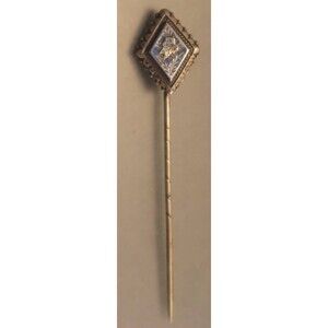 Sweet vintage stickpin features a raised and engraved butterfly or other insect on a diamond shaped head with engraved floral background. Its unmarked and hollow but looks and feels like sterling silver.