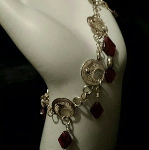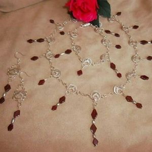 Delicate Three piece suite features necklace, earrings and bracelet. Handcut natural garnet, sterling filigree circles, chain, findings and magnetic clasps. Renaissance inspired style.
