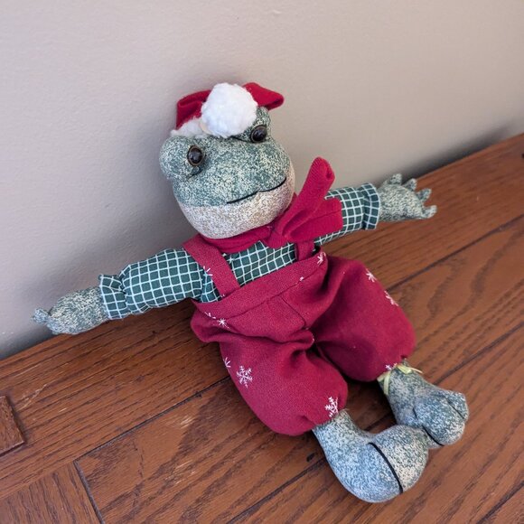 Add some whimsy to your Christmas decor with this sweet shelf-sitter plush frog from Sterling, Inc. 12 inches tall (cannot stand on his own), the frog wears a Santa hat, a green plaid shirt and red overalls with snowflakes on them. EUC!