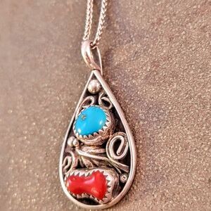 Sterling Navajo Jeff Largo Blue Turquoise Red Coral Tear Drop Pendant Necklace