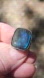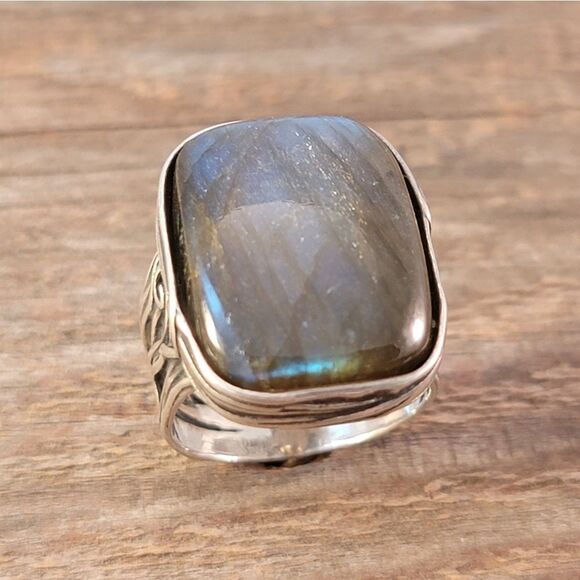 Sterling Paz Labradorite cabochon rectangle bezel set organic swirls statement Ring. The stone reflects a beautiful blue in the light. Crafted in Israel.
