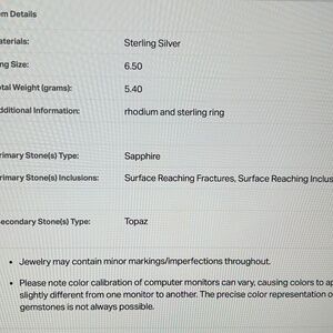 Rhodium and Sterling. Primary stone - Sapphire. Secondary Stones - White Topaz. Ring Size - 6.5. Total Weight - 5.4 (grams).