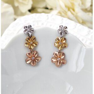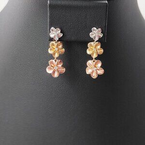 Sterling Plumeria Flower Drop Earrings Post CZ Silver Rose Gold Tone Hawaiian