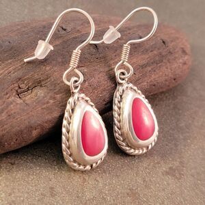 Add a pop of color to your outfit with these vintage sterling silver red coral teardrop dangle earrings with twisted cable bezel detail. Perfect for any occasion. Made in Mexico.