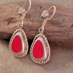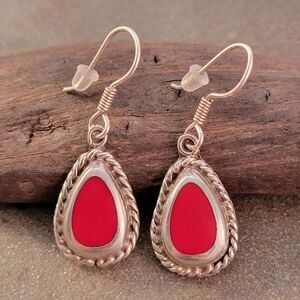 Add a pop of color to your outfit with these vintage sterling silver red coral teardrop dangle earrings with twisted cable bezel detail. Perfect for any occasion. Made in Mexico.