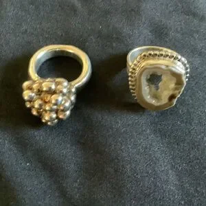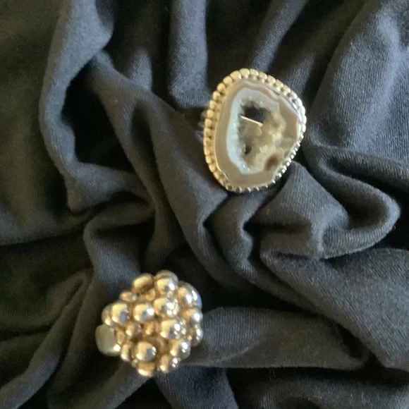 Set of two unique sterling rings. The circle ring is 1/2 inch tall. The ring opening is just shy of 3/4”. Size 7. The stone ring is 3/4” X 1”. The inside measurement is 3/4” size 8.