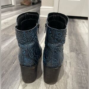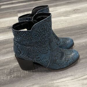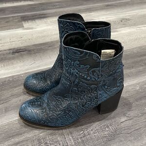 Sterling River Boots blue embossed leather booties/ankle boots. These short cowboy boots are sure to get noticed with the color and the embossed floral and leaf pattern.