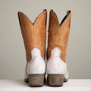 Sterling River Cowboy Boots Two Tone White Tan Embroidered Leather. Womens Size 9. These cute cowgirl boots are in great pre-owned condition with some general wear, mostly on the bottoms.