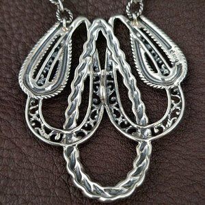 Sterling Signed Carolyn Polack Relios Sterling Filigree Openwork Necklace Southwestern Style. Piece is from "lasting connections" line and signed R 925 c. Necklace weighs 1.1 ounces, measures 2 1/4' X 2' and is 23 inches long total. Scrolled Pendant on link chain with a removable 3.5" chain extender.