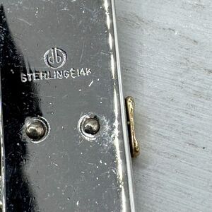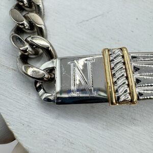 Marked STERLING & 14K with a circular db makers stamp on the back. Classic curb chain design with monogram plate and gold-accented bar details.