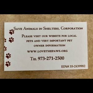 Save Animals In Shelters, Inc.-a registered not-for-profit 501(c)(3)charity Employer ID number: 35-2439982. Please visit our website for important information EVERY pet owner should know and over all pet welfare in USA. LOVETHEPETS ORG