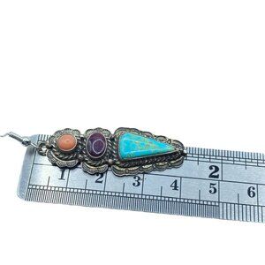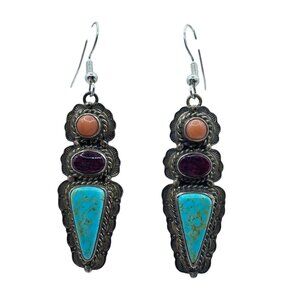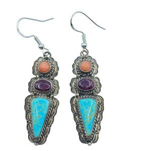 Sterling Silver 3 Stone Stamped Turquoise Coral Sugalite Dangle Earrings Native