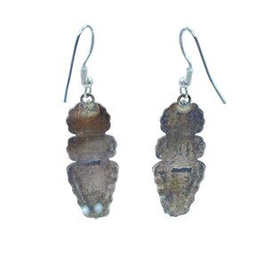 Stunning vintage Sterling silver stamped southwestern earrings. These have beautiful Turquoise, Sugalite, and angel skin coral stones. The stamping is beautiful! And these have a beautiful patina. I have added brand new Sterling silver hooks. I believe these are Native made but I’m not 100 percent sure.
