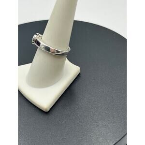 This is an elegant sterling silver ring featuring a stunning oval amethyst as the centerpiece. The ring showcases a sophisticated design with the main oval amethyst stone (8x5x2mm) beautifully bezel-set in the center, flanked by two smaller rectangular amethyst accent stones on either side. The sterling silver band has a sleek, polished finish and bears a heart maker's mark. The ring weighs 4.7 grams and is sized at 8.25.