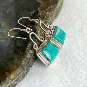Sterling Silver 925 Rectangular Bezel Set Faux Turquoise Dangle Earrings