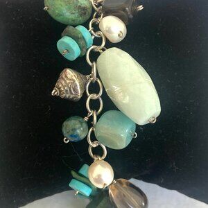 Sterling Silver 925 Beaded Multistone Turquoise Jadeite Aventurine Pearl Quartz Cable Chain Charm Bracelet Cha Cha Bracelet