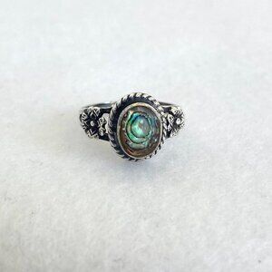 Sterling Silver 925 Bezel Set Oval Abalone Shell Floral Accent Ring Sz 3.75