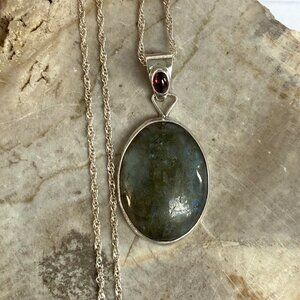 Sterling Silver 925 Bezel Set Oval Labradorite Garnet Pendant Necklace 20" Chain