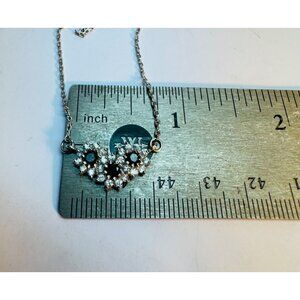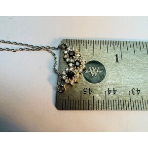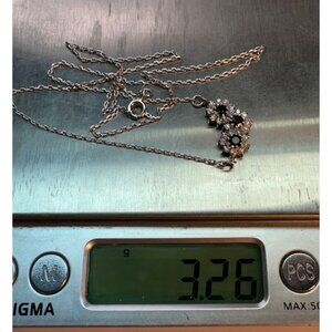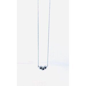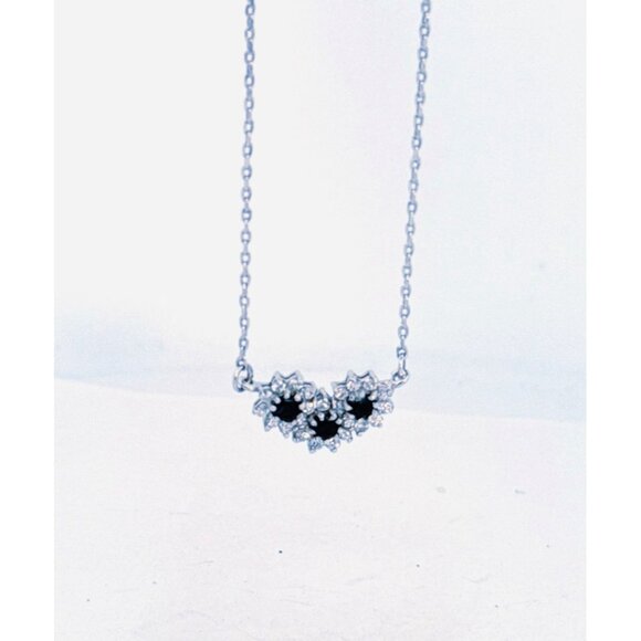 This stunning Sterling Silver 925 pendant necklace features a beautiful arrangement of three flower designs, each adorned with a black gemstone center surrounded by sparkling white gemstones. The delicate 16-inch chain is secured with a reliable spring ring clasp. Weighing 3.26 grams, this elegant piece is perfect for any occasion, from casual wear to formal events. A timeless accessory that adds charm and sophistication to your jewelry collection.