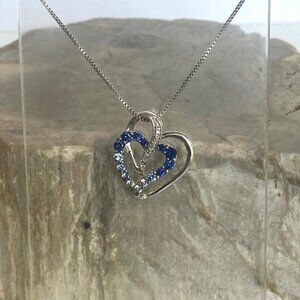 Sterling Silver 925 RJ Blue & White Sapphire Diamond Double Open Heart Pendant Necklace