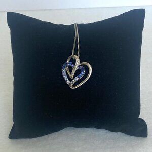 Gorgeous multi-toned blue sapphire with diamond accent stones along the outer double heart pendant.