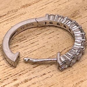 These Sterling Silver 925 CZ Huggie Earrings feature round-shaped zircon stones set in sterling silver with a hook closure. The huggie style design fits snugly on the earlobe, making them a stylish and comfortable choice for everyday wear. The earrings are signed by the maker and have a sleek silver color with colorless white zircon stones, adding a touch of elegance to any outfit. Perfect for those looking for a subtle yet chic accessory to elevate their look.