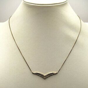 Elegant sterling silver necklace featuring a chevron V-bar pendant pave set with 44 round diamonds. Each stone measures approximately .015 carats, for a total weight of about 0.66 carats. Stamped 925 on clasp. Chain length is 17 inches plus a 1 inch extender, perfect for layering.