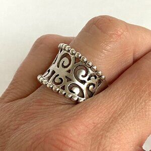 Sterling Silver 925 Curved Pierced Scrollwork Wide Band Ring Tapered Shank