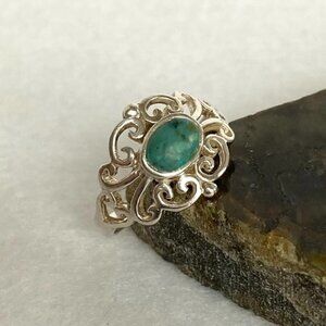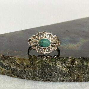Sterling Silver 925 Cutout Pierced Scrollwork Oval Simulated Turquoise Ring