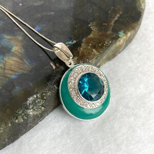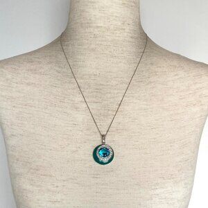 Sterling Silver 925 Round Turquoise Enamel & Rhinestone CZ Pendant Necklace By Chateau D’Argent & David Sigal