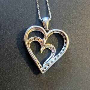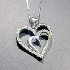 Elegant and timeless, this sterling silver necklace features a delicate 20-inch box chain with a sparkling double-heart pendant. One heart is accented with shimmering clear stones, while the other is polished silver, symbolizing love and connection.