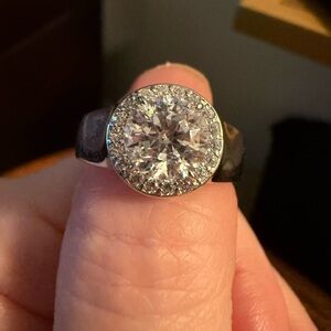 Stunning sterling silver halo cocktail ring featuring a brilliant round-cut cubic zirconia center stone, surrounded by a sparkling halo of smaller CZ accents.