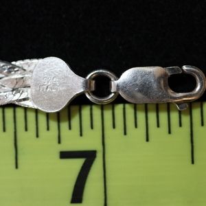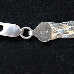 This Sterling Silver 925 bracelet is a flat 5 chain weave of Franco links. It is intertwined V-shaped links with a square side profile. It weighs 5.8 grams. It is 7.5” in length. The stamp “JCM” is on one of the end links & the other side of the end link it is stamped “I925 Italy”.