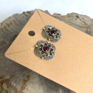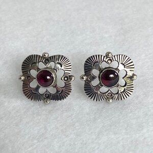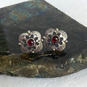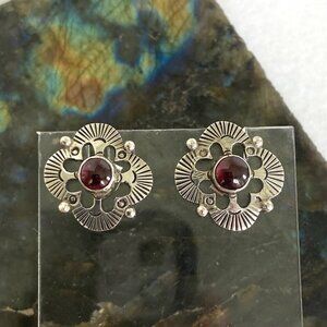 Sterling Silver 925 Garnet Cabochon Southwest Style Stamped Stud Earrings