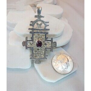 Sterling Silver 925 Garnet Ethiopian Orthodox Coptic Christian Cross Pendant 24g