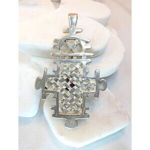 This sterling silver pendant is hand made in the traditional Ethiopian Orthodox Coptic Christian cross design,, adorned with a vibrant garnet stone. Handcrafted in Ethiopia. , this unique piece showcases the intricate craftsmanship and cultural significance of African jewelry. Measures: 65mm x 40mm. Weight: 23.3 grams. all sterling silver.