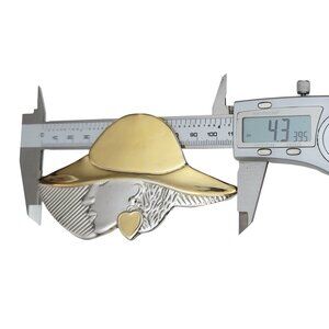 This charming brooch features an intricate design of a Lady. A gold vermeil hat sits atop her head. It measures approximately 4.3 inches wide and 2.4 inches long. Marked 925 at the back, finished with a secure locking pin that is in good working condition. This piece reflects dents and scratches. Please see the images.