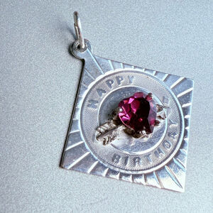 Gorgeous Happy Birthday Charm Pendant perfect for a charm bracelet or necklace. It has a heart shape Simulated Ruby (July Birthstone) and an arrow going through the background of the stone. Diamond shape pendant with rays detailed branching from all around the center.