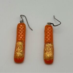 Sterling Silver 925 Hook Orange Resin Dangle Earrings with Gold Tone Flakes and Dots