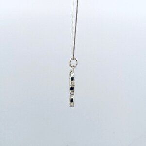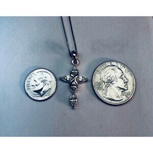 This elegant 925 sterling silver cross pendant features five sparkling marquise-cut cubic zirconia stones arranged in a beautiful intertwined design. The pendant hangs from an 18-inch Italian-made sterling silver box chain stamped 925 Italy. Total weight is approximately 4.1 grams. A timeless and meaningful piece perfect for daily wear or gifting.