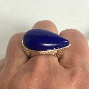 Sterling Silver 925 Italy Large Lapis Lazuli East West Teardrop Cocktail Ring Mixed Metal Yellow Gold Vermeil