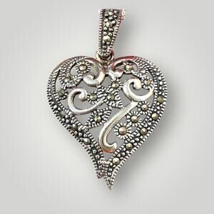 Sterling Silver 925 Marcasite Heart Pendant Necklace Ribbon & Chain 18 inch
