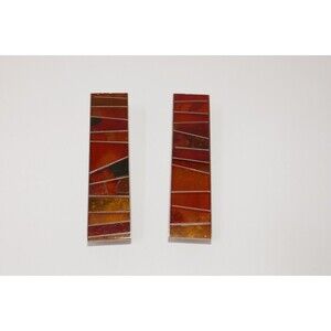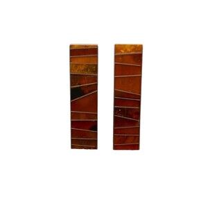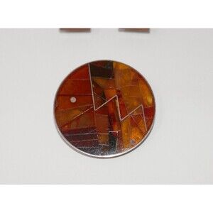 This vintage brooch and clip-on earrings set features a modernist design with beautiful multicolor amber inlay, set in a sterling silver 925 metal base. The circular shape of the brooch measure 1.375 inches in length, and the earrings are 2 inches long making them the perfect statement piece for any fine jewelry collection. This set is ideal for women who love vintage and antique jewelry and appreciate unique pieces with a story. The brooch and earrings are signed by different brands, ensuring their authenticity but pair well together. Add this stunning multicolor amber inlay set to your jewelry collection today! The brooch weighs 9.2 grams and the earrings are 16.4 grams with a few small chips on the bottom edges.